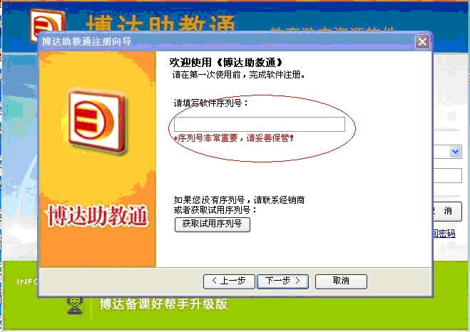 其一,没有博达助教通账号(也没有博达教育网账号)的,直接选择获取试用序列号,(见下图中红色椭圆框标记处):