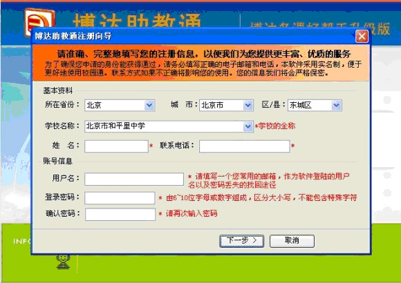 填写资料时,请注意按照要求提示如实填写,本软件为实名注册,如资料不全或明显失真,将影响软件的使用。资料填写完毕,确认无误,单击“下一步”,即可完成注册。